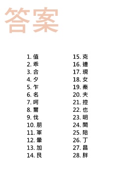 答案 1. 值 15. 克 2. 乖 16. 連 3. 合 17. 現 4. 夕 18. 女 5. 乍 19. 秦 6. 名 20. 夫 7. 呵 21. 控 8. 爾 22. 也 9. 伐 23. 明 10. 朋 24. 間 11. 軍 25. 陪 12. 暈 26. 丁 13. 加 27. 昌 14. 艮 28. 胖