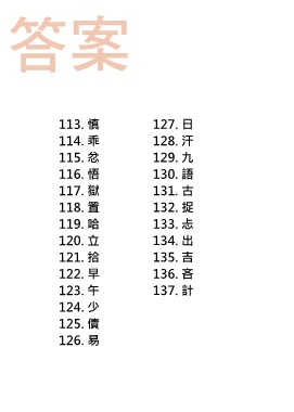 答案 113. 慎 127. 日 114. 乖 128. 汗 115. 忿 129. 九 116. 悟 130. 語 117. 獄 131. 古 118. 置 132. 捉 119. 哈 133. 忐 120. 立 134. 出 121. 拾 135. 吉 122. 早 136. 吝 123. 午 137. 計 124. 少 125. 債 126. 易