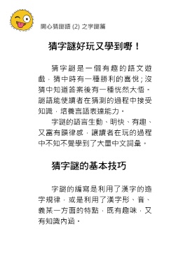 開心猜謎語 (2) 之字謎篇 猜字謎好玩又學到嘢! 猜字謎是一個有趣的語文遊 戲,猜中時有一種勝利的喜悅 ; 沒 猜中知道答案後有一種恍然大悟。 謎語能使讀者在猜測的過程中接受 知識,培養言語表達能力。 字謎的語言生動、明快、有趣、 又富有韻律感,讓讀者在玩的過程 中不知不覺學到了大量中文詞彙。 猜字謎的基本技巧 字謎的編寫是利用了漢字的造 字規律,或是利用了漢字形、音、 義某一方面的特點,既有趣味,又 有知識內涵。
