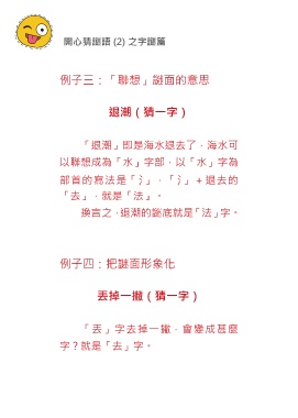 開心猜謎語 (2) 之字謎篇 例子三:「聯想」謎面的意思 退潮(猜一字) 「退潮」即是海水退去了,海水可 以聯想成為「水」字部,以「水」字為 部首的寫法是「 」,「 」+退去的 「去」,就是「法」。 換言之,退潮的謎底就是「法」字。 例子四:把謎面形象化 丟掉一撇(猜一字) 「丟」字去掉一撇,會變成甚麼 字?就是「去」字。